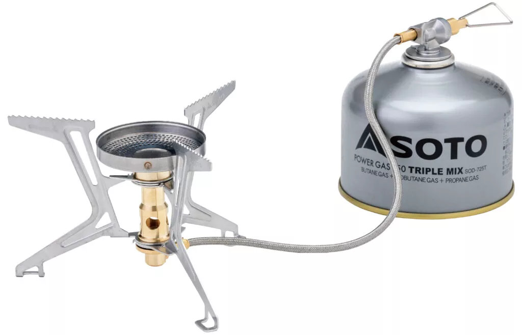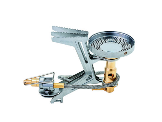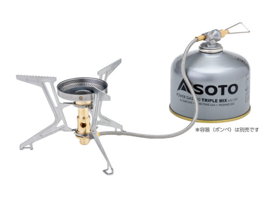 เตาแบบแยกหัวเตาจากกระป๋อง (Remote stove) ใช้เชื้อเพลิงกระป๋องเกลียวชนิด OD พร้อมไมโครเรกูเลเตอร์ ขนาดกะทัดรัด อัปเกรดเพื่อการปีนเขา/เทรคกิ้ง: หัวเตาทรงกะละมัง/กรวย (suri-bachi) ทนลมดีเยี่ยม และขาตั้งภาชนะ 3 ขาเกาะพื้นไม่เรียบได้มั่นคง จ่ายไฟเสถียร ไม่แผ่วง่ายจากแรงดันในกระป๋องที่ลดลงระหว่างใช้งานต่อเนื่องหรือในอากาศเย็น พับเก็บกะทัดรัด