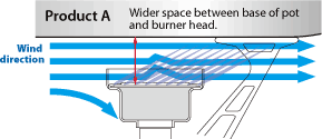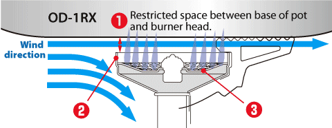โครงสร้างการเผาไหม้ทนลม โครงสร้างหัวเตาแบบเฉพาะเป็นทรง “ครก” (ทรงกรวยลึก) ที่ขอบยกสูง ① ทำหัวเตาให้เป็น “ทรงครก” ที่ด้านข้างสูง เพื่อป้องกันการรุกล้ำของลมจากด้านข้าง แม้ในสภาวะลมแรง ใจกลางเปลวไฟแทบไม่ถูกพัด ทำให้ให้ความร้อนตรงกึ่งกลางก้นหม้าได้ต่อเนื่องและต้มน้ำให้เดือดได้ในเวลาอันสั้น