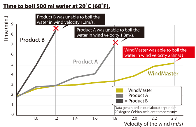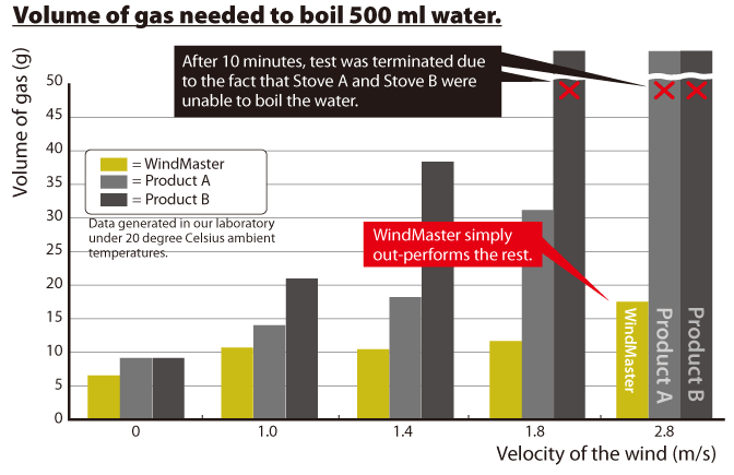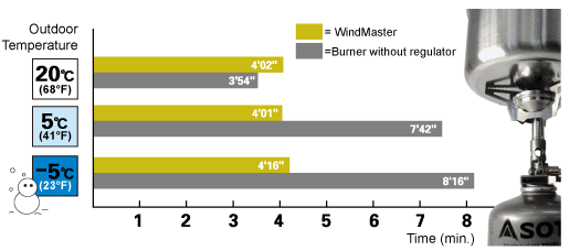 สรุป: WindMaster ใช้เวลาประมาณ 4 นาทีคงที่ แม้อากาศหนาว ขณะที่เตาไม่มีเรกูเลเตอร์ช้าลงมากเมื่ออุณหภูมิลดลง. ปริมาณก๊าซที่ต้องใช้ในการต้มน้ำ 500 มล.